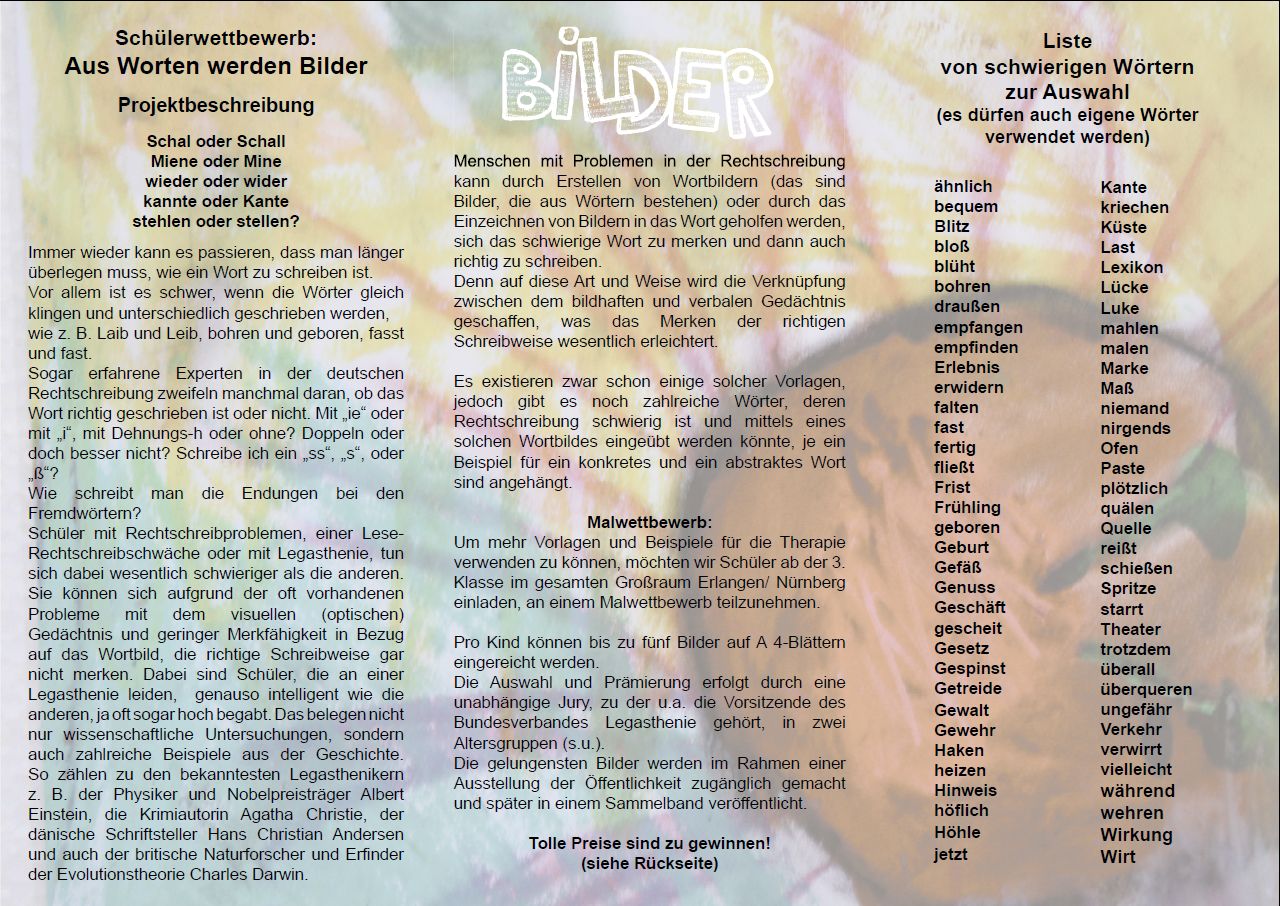 Menschen mit Problemen in der Rechtschreibung kann durch Erstellen von Wortbildern (das sind Bilder, die aus Wörtern bestehen) oder durch das Einzeichnen von Bildern in das Wort geholfen werden, sich das schwierige Wort zu merken und dann auch richtig zu schreiben. Denn auf diese Art und Weise wird die Verknüpfung zwischen dem bildhaften und verbalen Gedächtnis geschaffen, was das Merken der richtigen Schreibweise wesentlich erleichtert. Es existieren zwar schon einige solcher Vorlagen, jedoch gibt es noch zahlreiche Wörter, deren Rechtschreibung schwierig ist und mittels eines solchen Wortbildes eingeübt werden könnte, je ein Beispiel für ein konkretes und ein abstraktes Wort sind angehängt. Um mehr Vorlagen und Beispiele für die Therapie verwenden zu können, möchten wir Schüler ab der 3. Klasse im gesamten Großraum Erlangen/ Nürnberg einladen, an einem Malwettbewerb teilzunehmen. Pro Kind können bis zu fünf Bilder auf A 4-Blättern eingereicht werden. Die Auswahl und Prämierung erfolgt durch eine unabhängige Jury, zu der u.a. die Vorsitzende des Bundesverbandes Legasthenie gehört Frau Christine Sczygiel, in zwei Altersgruppen (s.u.). Die gelungensten Bilder werden im Rahmen einer Ausstellung der Öffentlichkeit zugänglich gemacht und später in einem Sammelband veröffentlicht.